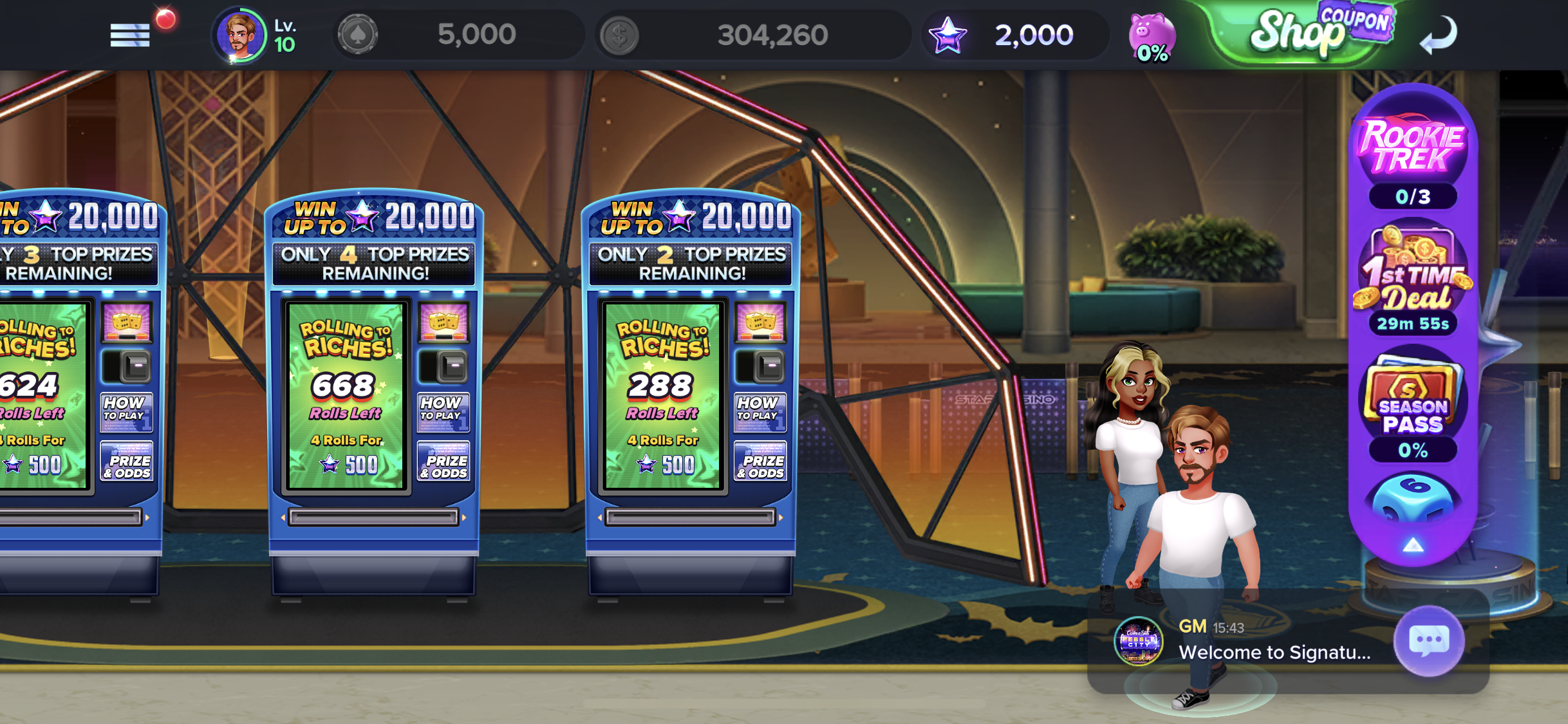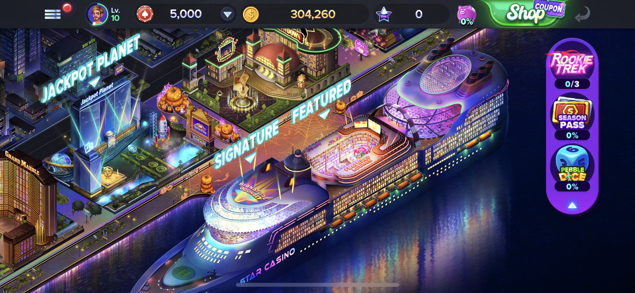 Having explored our land-based casinos, Jackpot Planet and SHOWDOWN, it’s time to get on board the STAR cruise ship! The STAR Casino delivers a premium gaming experience, featuring thrilling slot and lottery games powered by a unique in-game currency: Stars (Learn how to earn Stars here). But keep in mind, the STAR Casino might not be accessible to first- time visitors to Pebble City. As you progress through the Rookie Trek mission in Pebble City, keep an eye on your map - you’ll soon see the cruise ship docking, ready to welcome you aboard. Now, let’s head over to the Featured lounge, where exclusive slots await!